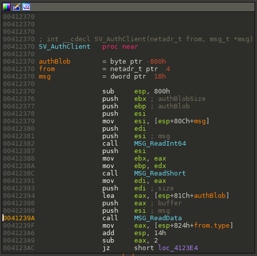 then you could potentially help me. it isn't much that has to be done. Long story short: I want to play a game which has RCE-vulnerbilities and I want to fix them via asm (byte codes in new allocated memory and writing to an address to change call to jmp), 32 bit process ``` In the function SV_SteamAuthClient, the length of the user's authBlob is not checked to be smaller than the allocated buffer on the stack before the call to MSG_ReadData. Overflowing the buffer using a modified steamAuth packet enables arbitrary code execution. ``` My Idea would be to allocate new memory at runtime and write the buffer-check there including a jump back to the address where it should continue. In the meantime I want to change the call of the function-call which overflows to a direct jump to my allocated memory. btw that part right there is from another part of gameseries, so the actual offset is different (but I got it already).