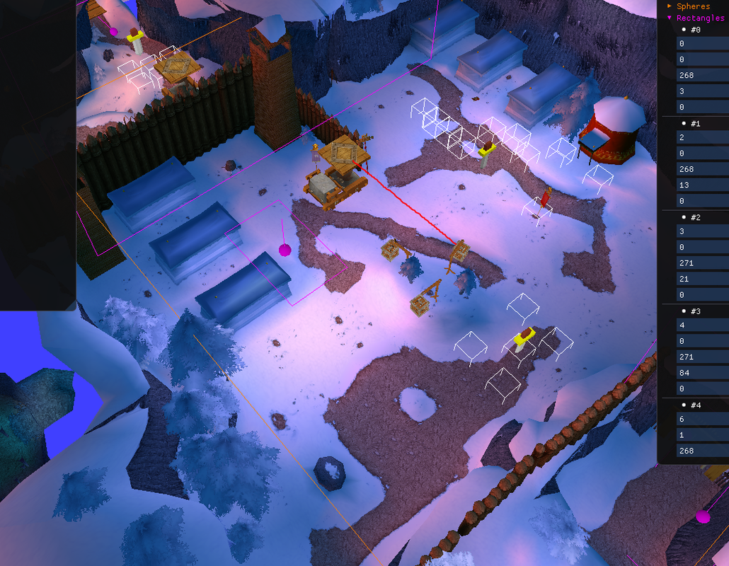 The purple rectangle pointing up triggers the fight and makes the enemies spawn, however the **CKMsgAction** has a trigger too, which will make the enemies switch their choreography. if you walk over the red line the **CKMsgAction** triggers and sends event **0D23** to the Enemy Squad which will reset the enemy count and spawn the enemies
