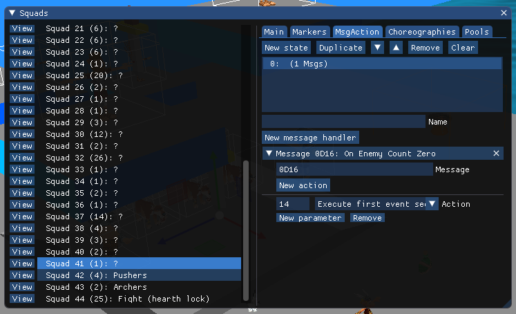 ```c /* MsgAction Callbacks */ CKGroupSquadEnemy 0D13 On squad spawn CKGroupSquadEnemy 0D15 On timer expire CKGroupSquadEnemy 0D16 On all enemies dead CKGroupSquadEnemy 4D00 While inside seUnk1 cube CKGroupSquadEnemy 4D01 While outside seUnk2 cube CKGroupSquadEnemy 4D02 While asterix has potion CKGroupSquadEnemy 4D17 While asterix has no potion CKGroupSquadEnemy 4D08 On enemy hurt CKGroupSquadEnemy 4D09 On enemy death CKGroupSquadEnemy 4D0B On guard spot hero CKGroupSquadEnemy 4D0C On guard regrouped CKGroupSquadEnemy 4D0D-4D0F custom event CKGroupSquadEnemy 4D10 While in bounding box CKGroupSquadEnemy 4D11 While outside bounding box CKGroupSquadEnemy 4D05 While at destination (target hook / marker) ```
